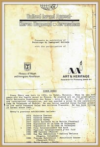 Simon was born in Morocco and studied at the Beaux Arts Academy (1) in Paris. During his life, Shimon exhibited in exhibitions in Israel and abroad and won various awards for his works. Painting was his whole life, so he gave up family life and children. His works focused on biblical stories, emphasizing traditional Jewish elements. These motifs were painted over the years in oil paintings on canvas. It can also be seen that he incorporated a variety of unique techniques in his paintings.